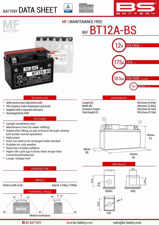 BS AKUMULATOR BT12A-BS (YT12A-BS) 152X88X106 12V 10AH BEZ ODRŽAVANJA - ELEKTROLIT ODVOJENO (175A) UE2019/1148 (4)