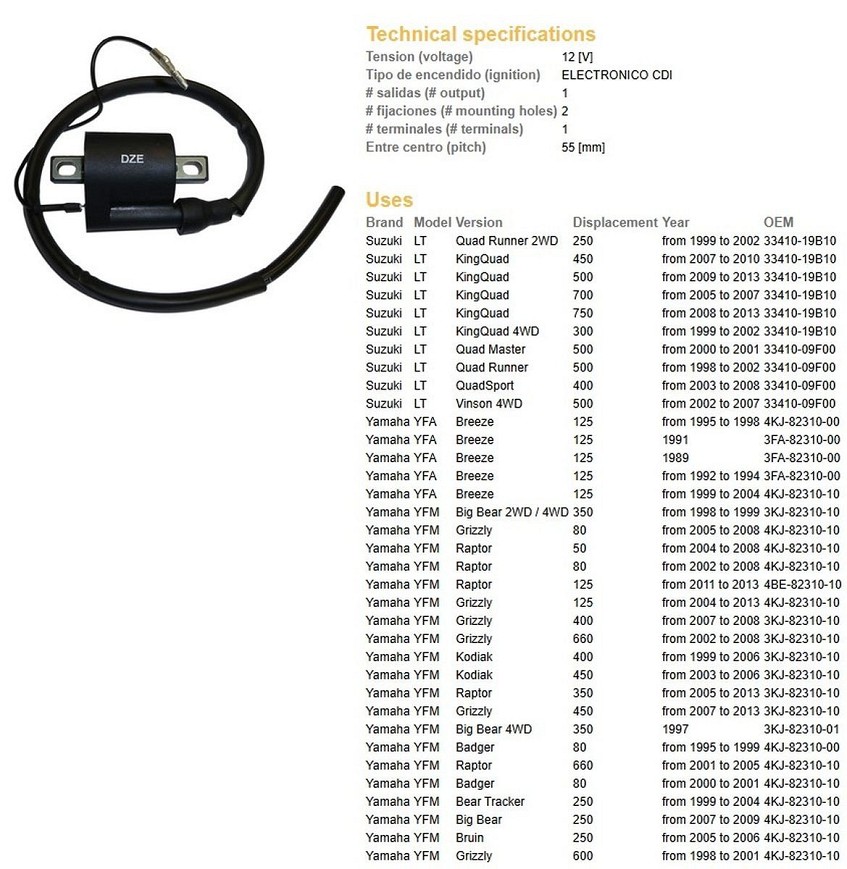 DZE KALEM PALJENJA SUZUKI DRZ 400 '00-'12, KING QUAD 700/750 '05-'13, YAMAHA GRIZZLY/RAPTOR/KODIAK 350/400/450/600/660