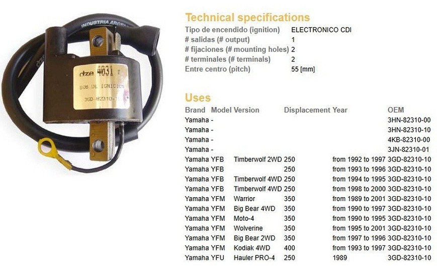 DZE KALEM PALJENJA YAMAHA YFB 250 TIMBERWOLF '92-'00; YFM 350 '89-'01; YFM 400 KODIAK '93-'97 (OEM-3DG-82310-10-10, 3DG-82310-10-00)