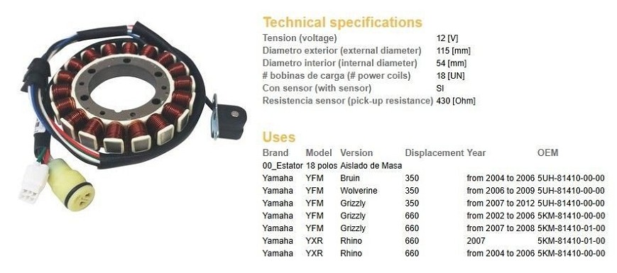 DZE NAMOTAJ ALTERNATORA STATOR YAMAHA YFM 350 BRUIN '04-'06; YFM 350 WOLVERINE '07-'09; YFM 350 GRIZZLY '07-'12; YFM 660 GRYZZLI '02-'08; YXR 660 RHINO '04-'07 (OEM 5KM-81410-00-00; 5UH-81410-00-00)