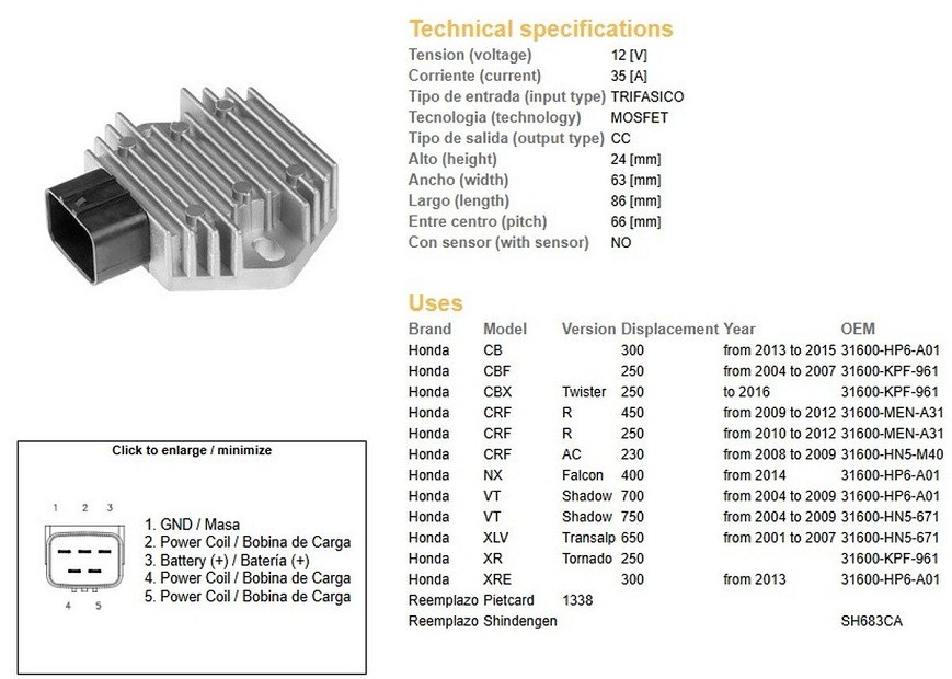 DZE REGULATOR NAPONA HONDA CB 300 '13-'15; CBF 250 '04-'07; CRF 250/450R '09-'12; VT 700 SHADOW '04-'09; VT 750 SHADOW '04-'09; XL 650V TRANSALP '01-'07 (31600-KPF-961)
