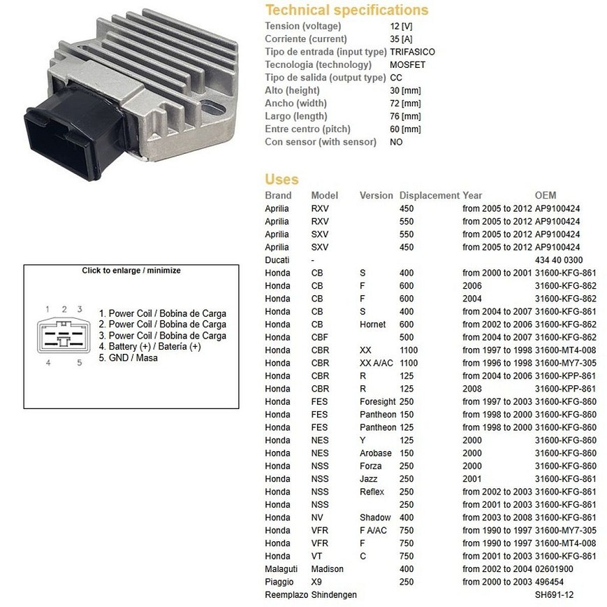 DZE REGULATOR NAPONA HONDA CB 600F '02-'06; CBF 500 '04-'07; CBR 1100XX '96-'98; FES 125/150/250 '97-'03; NES 125/150/250 '01-'03; VFR 750F/A/AC '90-'97; APRILIA; MALAGUTI;PIAGIO (35A) (31600-MY7-305) - ZAMENJUJE 2055-01