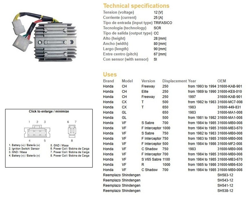 DZE REGULATOR NAPONA HONDA CH 250 '89-'97; CX 500/650 '82-'83; GL 500/650; VF 700/750/1000/1100 (SH541-12) (ESR650,ESR749,RGU-103)