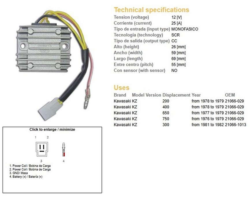 DZE REGULATOR NAPONA KAWASAKI KZ 200 '78-'79; KZ 300 '81-'82; KZ 400 '78-'79; KZ 650 '77-'79; KZ 750 '76-'79 (21066-1013/029) (ESR600)