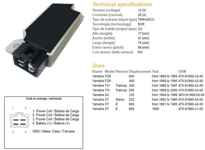 DZE REGULATOR NAPONA YAMAHA TW 200 '88-'00; XT 225 SEROW '92-'95; FZR 400/600 '88-'94; XT 600E '90-95 (ESR083) (47X-81960-A2-00) (35A)