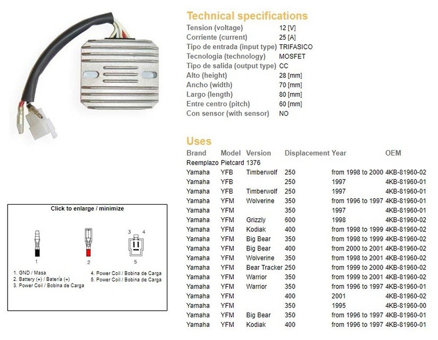 DZE REGULATOR NAPONA YAMAHA YFM 350 BIG BEAR '96-'99, WARRIOR 350 '96-'01, WOLVERINE 350 '95-'01, YFM 400 KODIAK '98-'99; YFM 600 GRYZZLI '98 (ESR633) (4KB-81960-02)