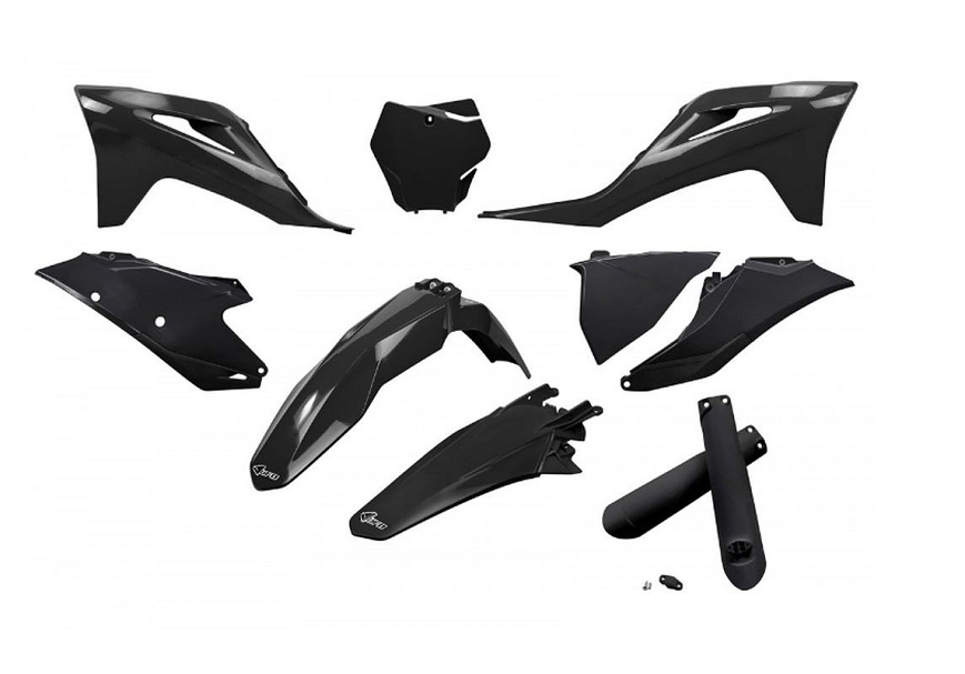 UFO KOMPLET PLASTIKE (FULL KIT) SA ŠTITNICIMA TELESKOPA (AMORTIZERA) GAS GAS MC 125 / 250 '21-'23, EX 250 / 300 '21-'23, MC-F / EX-F 250 / 350 / 450 '21-'23 BOJA CRNA