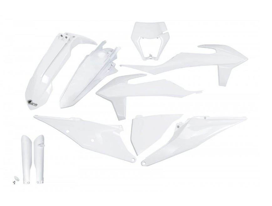 UFO KOMPLET PLASTIKE (FULL KIT) SA ŠTITNICIMA TELESKOPA (AMORTIZERA) KTM EXC 125 '20-'21, EXC 250 / 300 TPI '20-'23, EXC-F 250 / 350 / 450 / 500 '20-'23 BOJA OEM BELA