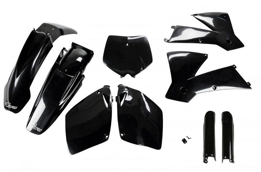 UFO KOMPLET PLASTIKE (FULL KIT) SA ŠTITNICIMA TELESKOPA (AMORTIZERA) KTM SX-SXF '01-'02 BOJA CRNA