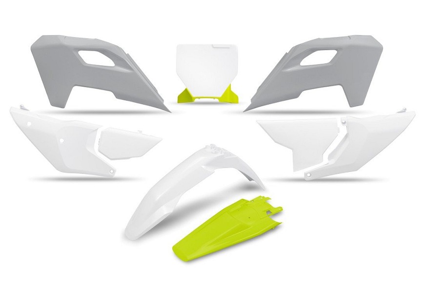 UFO KOMPLET PLASTIKE HUSQVARNA TC 125 / 250 '23-'24, FC 250 / 350 / 450 '23-'24, FX 350 / 450 '23-'24, TX 300 '24, BOJA OEM '24 ( BELA / ŽUTA ) (PRODUŽENA TABLICA ZA STARTNI BROJ)